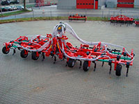 Ширина делает необходимостью использовать опорные колеса. Для настройки глубины модель«Ольденбургер XL / Oldenburger XL» располагает широкими опорными колесами: 4 опорных колеса для версии 6 м, 6 опорных колес для машины с рабочей шириной 7,80 м, 9 м и 10,20 м. Данные колеса можно отрегулировать просто с помощью прочного шпинделя.